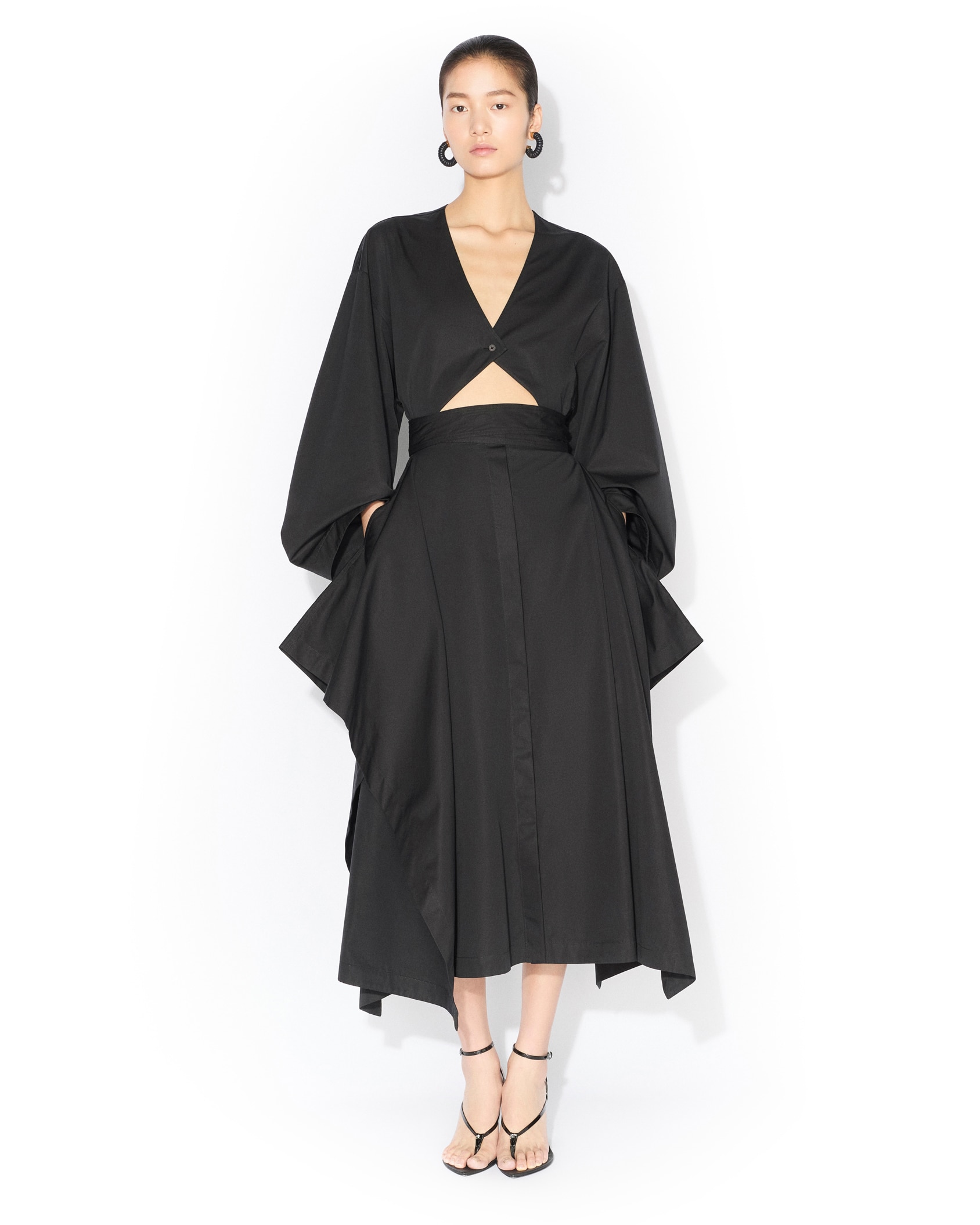 Trench dress in cotton poplin V-neckline, bust cut-out, long wide sleeves, side open ruffle details Ankle length T-shape cut Button closure, wrap belt with back patch Made in Italy